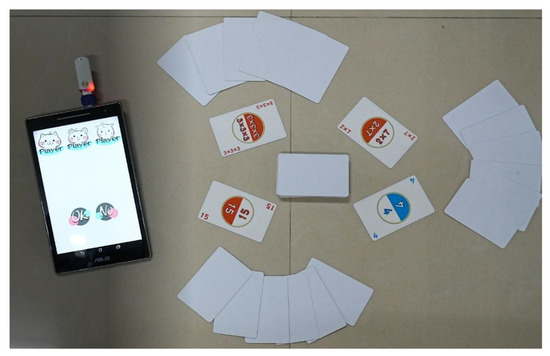 From the view of the board game design, the board game engages students in competing with peers that can motivate students to achieve learning aims []. Immediate reward is also a useful design to enhance students’ learning performance. In the proposed board game, the score mechanism encourages students to review and apply prime factorization concepts to gain a higher score []. Moreover, immediate feedback is important to improve students’ learning motivation and achievement during their learning process []. The proposed board game can provide immediate feedback to support and guide students when they apply wrong concepts or calculate incorrect results. Furthermore, the proposed board game requires students to play face to face. Past studies indicated that face to face interaction is significant to students for engaging in a meaningful learning process [,]. In addition, the proposed board game is a cyber physical system that includes a virtual board game application and real hand cards. The literature also pointed out that cyber physical systems are useful to enhance students’ learning motivation and further improve their learning achievement [,].