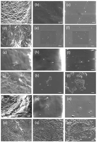 SEM images of rough (top row), smooth (middle row) and flat (bottom row) surfaces after 1 h (a–c) or 24 h (d–f) incubation with a human plasma conditioning film, 1 h (g–i) or 24 h (j–l) incubation with a human plasma with S. epidermidis conditioning film and 1 h (m–o) or 24 h (p–r) incubation with a human plasma with Ser. marcescens conditioning film. Scale bar = 10 µm.