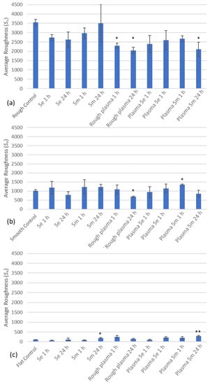 Finally, for the flat surface, due to the surface roughness already being significantly low (0.1 µm) when compared with the other two surfaces, most of the CFs demonstrated an increase in the average roughness. Only the 24 h Ser. marcescens (0.2 µm) (p < 0.05) and the 24 h Ser. marcescens in human plasma on the flat surface (0.3 µm) (p < 0.01) demonstrated significant differences in Sa value when compared to the control surface (Figure 2c).