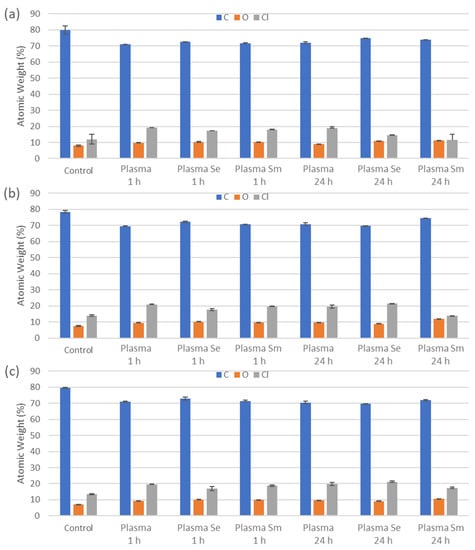 All three surfaces had no significant differences in the atomic weight of their elemental makeup when determined using EDX, typically between 78–80% carbon, 12–14% chlorine and 7–8% oxygen. After treatment with the CFs, all the surfaces had a change in these values, averaging 68% to 75% Carbon, 12% to 22% Chlorine and 8% to 12% Oxygen (Figure 3).