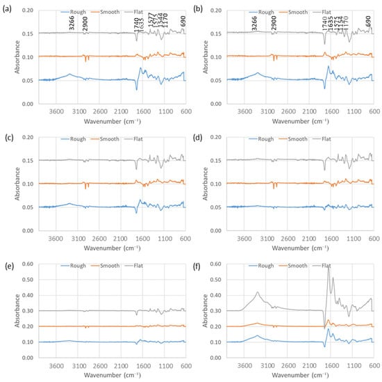 Using ATR-FTIR, the human plasma conditioned surfaces (Figure 4a/b), human plasma and S. epidermidis (Figure 4c/d) and human plasma and Ser. marcescens (Figure 4e/f) were analysed. For the human plasma conditioned, human plasma and S. epidermidis and human plasma and Ser. marcescens conditioned surfaces, on the rough, smooth and flat surfaces, at both 1 h (a, c and e) and 24 h (b, d and f). Note that these spectra are substrate subtracted in order to better resolve new IR bands associated with adsorption of the plasma and/or organism. Note that it is not possible to differentiate between the organisms and the plasma. The positive peaks are the new adsorption-related IR bands and the negative peaks relate to there being slightly less substrate related absorptions in the sample than the substrate reference. This is due better contact between the internal reflection element (IRE) and the treated samples than between the untreated substrate controls and the IRE. ATR-FTIR of the pPVC substrates has been discussed in a previous paper [23]—assignments for the negative peaks can be found here.