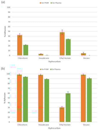 The effect of a human plasma CF on Ser. marcescens (Figure 5a) lowered the polar energy of the cells. Both the acid (chloroform) and basic (ethyl acetate) hydrocarbons demonstrated a reduction in the percent adherence after exposing the cells to the CF (from 42.2% to 21.9% for chloroform and from 48.3% to 33.9% for ethyl acetate), demonstrating that the ability for the cell to donate and accept electrons had been reduced, but was still within the moderate adhesion range (between 10% and 55%). The highly hydrophilic properties of Ser. marcescens did not change, with both non-polar hydrocarbons (decane and hexadecane) demonstrating almost no adherence (0.29% and 0.58% respectively).