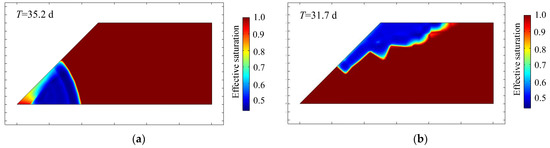 For the traditional heap leaching technology and the novel heap leaching technology, the seepage of the leaching liquid in the piles can be numerically simulated by the software COMSOL, as shown in Figure 2. With regard to the traditional heap leaching, the leaching area on the cross section can reach 91.3% of the total area. The ratio is 88.5% for the novel heap leaching technology. Although the leaching efficiency of the novel heap leaching technology is slightly lower, it is more environmentally friendly. It not only meets the vegetation restoration requirements on the top of the pile, but also reduces resources waste of rare earth elements through controlling the permeability. Therefore, the novel heap leaching technology provides a promising approach to solve the major issues that hinder the healthy development of the rare earth industry such as high environmental pollution and low leaching efficiency [8,9].