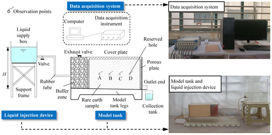 A self-designed and manufactured device was utilized to carry out the model test of the rare earth heap leaching under the lateral liquid injection conditions. The test device consisted of a model tank, a liquid injection device and a data acquisition system, as shown in Figure 3. The model tank was made of transparent acrylic sheets, and it was divided into three zones by using porous plates with a pore diameter of 0.4 cm. The left zone is a buffer zone, in which glass marbles were placed to provide a buffering effect for the leaching liquid to flow into the rare earth pile. A liquid inlet with a diameter of 0.8 cm was set at the left end of the buffer zone. At its top, an exhaust valve was installed to discharge the air within the buffer tank when the buffer tank was not fully filled with the leaching liquid. Once the buffer tank was completely filled, the exhaust valve was closed. The middle zone of the model tank was used for stacking the rare earth samples. This zone has a length of 25 cm, a width of 10 cm, and a height of 15 cm. In the real heap leaching of rare earths, the bottom of the pile would be inclined with a slope of 1–3% so that the leaching liquid can be drained freely from the bottom. In order to reproduce the reality, the bottom of the middle zone was set to be sloping with a gradient of 2%. On the side of the middle zone, four circular holes with intervals of 5 cm were reserved for connecting the sensors that are placed within the rare earth pile and the data acquisition instrument outside the model tank. The right zone of the model tank is a collection tank that was used to collect the exuded leaching liquid and mineral particles. The liquid injection device was composed of a support frame and a liquid supply box with a valve. The liquid supply box was connected with the model tank through a rubber tube. The data acquisition system contained pore water pressure sensors, a data acquisition instrument, and a computer. In the tests, the ammonium sulfate solution with a concentration of 2% was used as the leaching liquid. The distance from the model tank bottom to the free surface of the leaching liquid in the liquid supply box is defined as the hydraulic head of the leaching liquid, which is denoted by the symbol H.