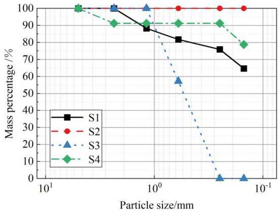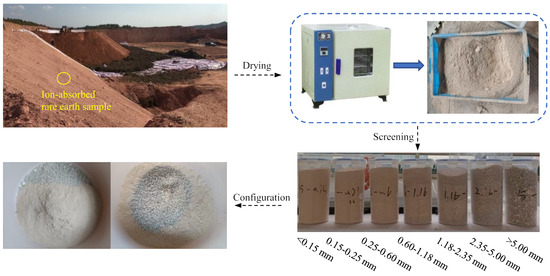 The ion-absorbed rare earth was first dried, and then, it was screened and divided into seven groups according to the particle size: particles that were smaller than 0.15 mm, particles that were within 0.15–0.25 mm, particles that were within 0.25–0.60 mm, particles within that were 0.60–1.18 mm, particles that were within 1.18–2.35 mm, particles that were within 2.35–5.00 mm, and particles that were larger than 5 mm. To facilitate their expression, the particles that were smaller than 0.25 mm were classified as fine particles, the particles that were within 0.25–2.35 mm were classified as medium particles, and the particles that were larger than 2.35 mm were classified as coarse particles. Based on the seven groups of particles, the rare earth samples for testing were configured, as shown in Figure 4. The rare earth sample that has the same particle gradation as the in situ rare earth is called the standard soil sample S1. The fine particles and medium particles were combined and configured as the soil sample S2. The combination of the medium particles and coarse particles is the soil sample S3, and the combination of the coarse particles and fine particles is soil sample S4. The mass percentages of each particle grade for the four soil samples are listed in Table 1.