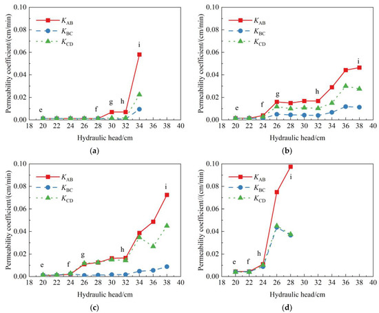 The permeability coefficients between the adjacent observation points of the rare earth pile are expressed as KAB, KBC, and KCD, respectively. The variations of these permeability coefficients with the increasing hydraulic head for the four soil samples are shown in Figure 6. With an increase in the hydraulic head of leaching liquid, the permeability coefficients show a trend of increase on the whole, and especially, the permeability coefficient KAB near the liquid injection end varies most significantly. The variation of KAB with the hydraulic head is clearly divided into four stages. In the first stage, namely, the curve e–f in Figure 6, the permeability coefficient is small and remains almost constant. This indicates that the seepage of the leaching liquid within the rare earth pile is in a stable state when the hydraulic head is small. In the second stage (see the curve f–g), the permeability coefficient increases slowly with the hydraulic head. This is because as the hydraulic head increases, the fine particles start to move in the pores of the soil samples due to the increasing seepage force. This enhances the connectivity between the pores, and accordingly, the permeability is increased. This stage is also the startup stage of the fine particle migration. In the third stage (see the curve g–h), the permeability coefficient tends to stabilize again. In the process of increasing the hydraulic head, more and more particles with various sizes participate in the migration. The co-migration of the particles of different sizes can easily cause the blockage of the pores, thereby preventing the connectivity of the pores and the increase of the permeability in the rare earth pile. In the fourth stage (see the curve h–i), the permeability coefficient increases substantially. This is because when the hydraulic head of leaching liquid is increased to a certain level, the particles that block the pores are driven to migrate again by the greater seepage force, and the connectivity of the pores is further increased. This stage is the development stage of preferential flow paths.
