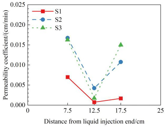 Figure 7 presents the permeability coefficients at different locations under the hydraulic head H = 30 cm for the soil samples S1, S2, and S3. It is clearly seen that under the lateral liquid injection conditions, the permeability coefficient of the rare earth pile exhibits a non-uniform distribution in space. Specifically, the permeability coefficients at both ends are greater than those in the middle part of the pile. For the standard soil sample S1, the permeability coefficient at the liquid injection end is greater by 89.3% than that at the middle location. The relative differences are 74.6% and 89.2%, respectively, for the fine-medium particle soil sample S2 and the medium-coarse particle soil sample S3. The spatial distribution of the permeability is more inhomogeneous for the standard soil sample S1 and the medium-coarse particle soil sample S3.