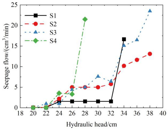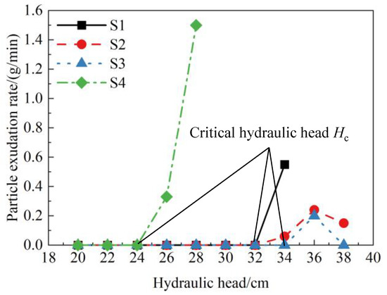 The rare earth particle exudation from the outlet end is clearly adverse to the pile stability, and furthermore, the faster the particles exude, then the worse the pile stability is. Figure 10 shows the variations of the particle exudation rate with the increasing hydraulic head for the four soil samples. The hydraulic head at which the rare earth particles begin to exude is defined as the critical hydraulic head of particle exudation Hc. It is seen from Figure 10 that the relationship of the critical hydraulic head between the four soil samples is Hc(S4) < Hc(S2) = Hc(S1) < Hc(S3). For the soil sample S4, because the sizes of the fine and coarse particles vary widely, the fine particles easily migrate within the pores between the coarse particles and exude from the rare earth pile. Therefore, it is critical that the hydraulic head of particle exudation is the smallest among the four soil samples. In the medium-coarse particle soil sample S3, driving the medium particles to exude from the outlet end requires a greater seepage force. Hence, the critical hydraulic head of particle exudation in this soil sample is the highest. In the soil sample S2 that lacks coarse particles, its critical hydraulic head of particle exudation is 32 cm, and it is the same as that in the standard soil sample S1. This means that the coarse particles have little constraint on the migration of the fine particles, and the medium particles play a major role in the constraint of this. In comparison with the soil samples S1 and S4, the soil samples S2 and S3 have a relatively gentle change in the particle exudation rate as the hydraulic head increases. It is consistent with the gentle variation of the permeability coefficient KCD in the soil samples S2 and S3. This shows in the fine-medium particle soil sample S2 and the medium-coarse particle soil sample S3, the particle migration degree near the outlet end is lower.