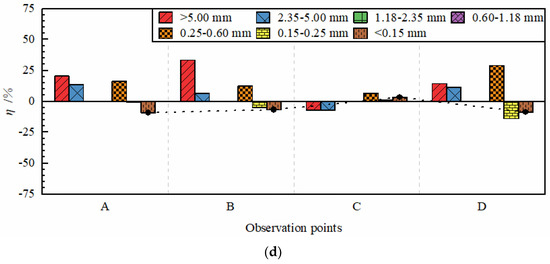Change rate of the particle mass for each grade at different observation points: (a) soil sample S1; (b) soil sample S2; (c) soil sample S3; (d) soil sample S4.
