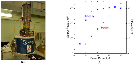 (a) General view of the 250 GHz gyrotron with TE19,8 operating mode. (b) Experimentally obtained dependence of the output power and efficiency on the value of the beam current.