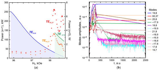 (a) Results of simulations for the 5th harmonic multiplication. Output power vs. guiding magnetic field for competing TE19,8 and TE−17,9 modes at the 1st cyclotron harmonic and for TE95,37 mode at the 5th cyclotron harmonic. Orange symbols depict the dependence of output power for the spread of electron velocities of 15%. (b) Establishment of the stationary oscillations in the process of competition between 12 modes at the fundamental cyclotron resonance.