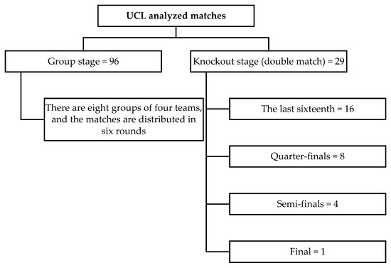 Regarding elite soccer competitions, Cerda et al. [18] analyzed the performance of players in the group and knockout stages of the 2018 FIFA World Cup together. This competition involves different elite players from all continents, and it shares the development of these stages of competition with the UEFA Champions League (UCL). There is previous research that studied these stages of competition in the 2014 [19] and 2018 [20] FIFA World Cups, focusing only on one of them and identifying performance indicators. With respect to the UCL, other previous studies also analyzed the group stage [21], knockout stage [22] and both stages [23].