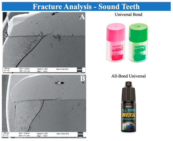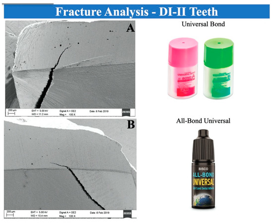 The etch and rinse procedure on dentin leads to the increased availability of dentinal tubules that can be infiltrated by the adhesive. The reduction of the presence of water that wets the surface, due to the drying process, increases the quantity of infiltrating resin and therefore the quality of the resin tags. The morphology of the hybrid layer on dentin of the two tested adhesives appears similar to that of the self-etch adhesives and the fourth and fifth generation adhesives reported in the literature (Figure 1C,D) [9]. The morphology of the tested adhesives on DE-II-affected dentin (Figure 3C,D) seems to confirm the possibility of using them in selective etch-and-rinse mode on dentin as was made in our previous works with a fifth-generation adhesive [17,18]. The adhesive failure found on the DI-II-affected samples treated with a fifth-generation adhesive in a previous work [17] was not found in the samples treated with the two universal nanofilled adhesives tested in this study (Figure 3C,D). The quality of the hybrid layer on DI-II-affected dentin, even if in total absence of resin tags, can be appreciated in Figure 2 and Figure 4. In all samples (sound and DI-II-affected teeth), the dehydration of the samples, due to processing for SEM observation, produced fractures through the enamel–dentin junction. The fractures intercept the composite reconstruction without debonding the above restoration from either the enamel or the dentin. This behavior was equivalent to that observed for samples on sound teeth (Figure 2), where similar features were observed and no separation of the restoration from either sound dentin or sound enamel was present.
