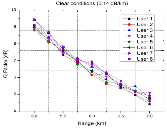 Figure 3 depicts the Q-factor for channels 1, 2, 3, and 4 transmitted using x-polarization and channels 5, 6, 7, and 8 transmitted using y-polarization versus the propagation range for the proposed FSO-PDM/PV-OCDMA system. At a 7 km propagation range, the Q-factor values for channels 1 and 5, 2 and 6, 3 and 7, and 4 and 8, respectively, are 4.7 and 4.6, 4.5 and 4.4, 4.8 and 5, and 4.9 and 4.9, respectively.