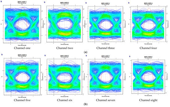 Figure 4 displays the eye diagrams for the eight channels that propagate on two different polarization signals (X at 0 degrees and Y at 90 degrees) at a 7 km propagation distance. As all channels have a wide eye-opening, they advocate successful information transmission with an overall capacity of 160 Gbps.