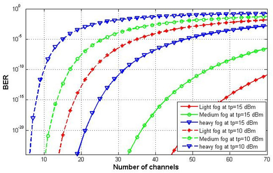 Figure 5 shows the BER versus the number of channels that the proposed system can support at different transmission powers under foggy weather conditions and for different transmitted power at 20 Gbps. As the level of fog rises, the attenuation increases, and the allowable number of channels decreases. The LF has an attenuation of 9 dB/km, which is increased to 16 dB/km under MF and further increased to 22 dB/km under HF [15]. Furthermore, the number of channels at = 15 dBm is higher than that at = 10 dBm. At BER 10−9 and = 10 dBm, the maximum number of channels is 25, 19, and 10, respectively, under LF, MF, and HF. These channels increased when = 15 dBm is used to 83 under LF, 58 under MF, and 36 under HF at the same value of BER.