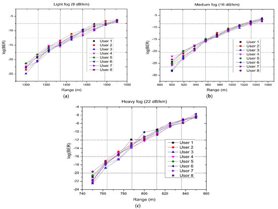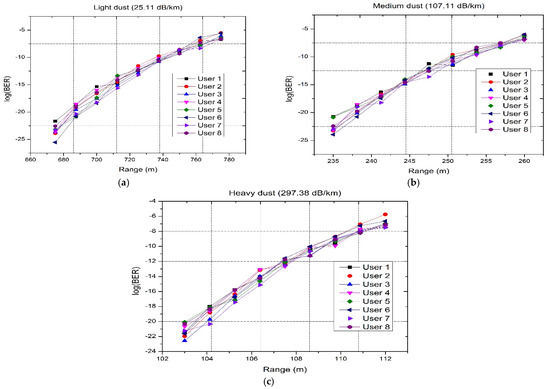 Figure 9 displays the log (BER) values under various dust storms versus the propagation distance for the eight simulated channels. Dust storms cause high attenuation to the information signal during propagation in the FSO channel, which leads to the shortest ranges compared to those achieved under fog conditions. The maximum transmission distance between the transmitter and the receiver under LD is 0.775 km, which decreases by 0.515 km under MD, and further decreases by 0.663 km under HD, which is seen in Figure 9a–c. This is expected as the attenuation value caused by dust storms is 25.11 dB/km, 107.11 dB/km, and 297.38 dB/km, respectively, under LD, MD, and HD, respectively [22].