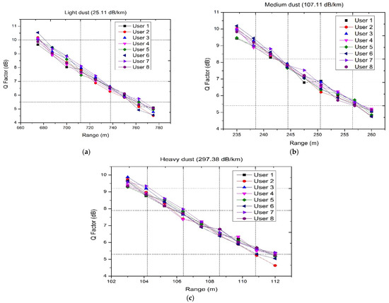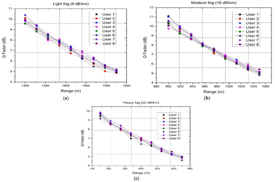Figure 6 and Figure 7 depict the log (BER) versus the propagation range for the eight channels and Q-factor versus the propagation range for the eight channels, respectively. As the level of fog rises, the attenuation increases, the propagation range decreases, and the Q-factor decreases. Additionally, as the LF has less attenuation, our proposed system achieved the longest FSO range for the eight channels under its effect, which is 1.525 km. This range is slightly decreased to 1.05 km when the level of fog becomes medium, while at the heaviest level of fog, the shortest FSO link is achieved at 0.85 km and that is cleared as the largest attenuation is caused under HF. All these ranges are considered at acceptable BER values (less than 3 × 10−3).