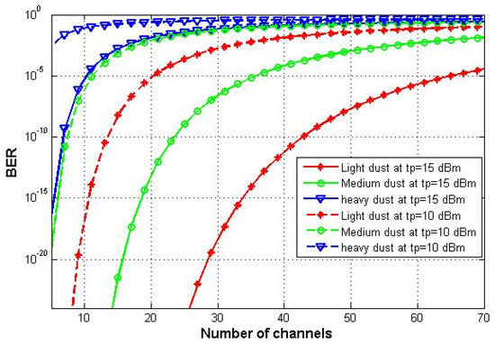 The effect of different dust storms (LD, MD, and HD) on the performance of the proposed system is investigated in this part. The BER versus number of channels at 10 dBm and 15 dBm transmitted powers and 20 Gbps data rate under different dust storms is depicted in Figure 8. As the dust storm becomes heavier, the maximum number of allowable channels decreases. At LD, the number of channels that our proposed system can support is 47 at 15 dBm transmitted power and BER 10−9 which is decreased to 25 channels under MD and 8 channels under HD at same values of BER and . As for lower transmitted power, which is 10 dBm, one can observe that lower number of channels can be used (15 for LD, 9 for MD, and 3 for HD).