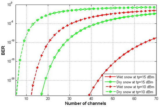 Finally, the impact of dry and wet snow on the link performance is studied for all eight channels. The BER versus different number of channels that can be supported by the proposed system under WS and DS at different transmitted power and data rate of 20 Gbps is devoted in Figure 11. As cleared from Figure 11, the system under WS can support larger numbers of channels which are 70 and 21, respectively, at 15 dBm and 10 dBm transmitted power at BER 10−9. However, under DS, the proposed model can support lower numbers of channels, which are 30 at 15 dBm transmitted power and 9 at 10 dBm transmitted power.