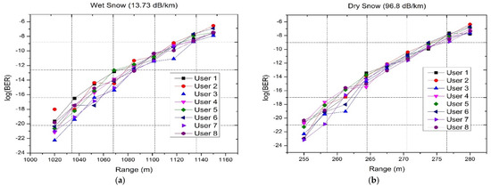 Moreover, the system with eight channels carry information is simulated under different snowfall rates to show the effect of the propagation ranges on the information signal. From Figure 12 and Figure 13, the maximum FSO link for eight simulated channels is 1.15 km under WS, which causes attenuation (13.73 dB/km) less than that caused under DS (attenuation is 96.8 dB/km [31]). So, the FSO range for eight channels is decreased to 0.28 km under DS. These ranges are taken at acceptable BER values (less than 2.5 × 10−3) and Q-factor values approximately 5. The computed log (BER) and the Q-factor for the eight channels at a propagation range of 1.15 km under DS, and 0.28 km under WS are given in Table 6.