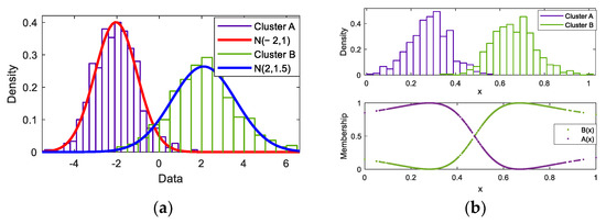 Firstly, a simple case is generated, i.e., one-dimensional synthetic data with two classes. This dataset contains a total of 1000 data points equally distributed in two classes with the Normal distribution N(−2, 1) and N(2, 1.5), as shown in Figure 3a.