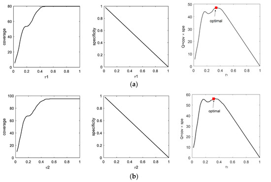 In the real-world decision-making process, we expect to obtain high accuracy with low computation overhead, so it is required to correctly classify which data points require “clerical review”. To realize these objectives, selection of the uncertain region’s size is first required to contain most of the data with high uncertainty degree. Then, this region should also guarantee high specificity of uncertain data for high-performed decision-making. To realize these requirements, the justifiable granulating algorithm [29] is applied here to realize the optimization of τ1 and τ2 separately.