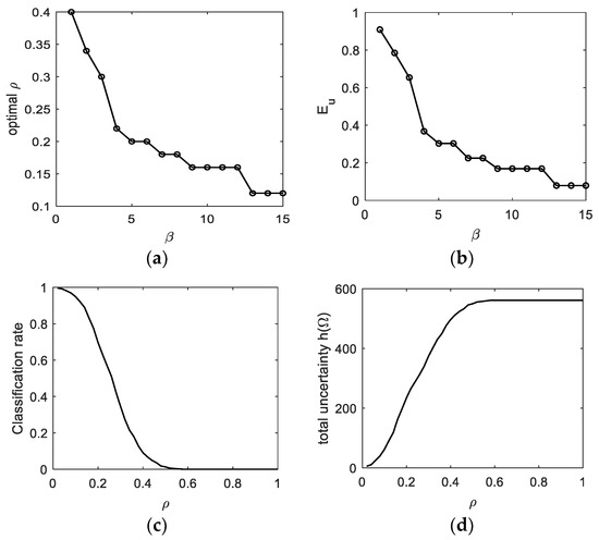 Figure 7a,b shows the values of optimal granule radius ρ and the percentage of points within the uncertain region (i.e., Eur) at a different parameter β, respectively. It is seen that, when the value of β increases, fewer points within the uncertain region, namely the optimal size of ρ, will decrease. In Figure 7c,d, the classification rate and the total entropy of the uncertain region via (10) are shown at different radius parameter ρ. It is seen that when the value of β increases, the optimal values of ρ and Eur correspondingly decrease. That is to say, when the uncertain region size increases, the uncertainty contained by the constructed granule increases but the classification rate decreases. For the well-performed classification rules, both the classification rate and the uncertainty of points for “clerical review” should be decided properly. Therefore, by setting different values of Eur as a constraint condition, uncertain granules are constructed optimally and utilized in the formation of classification rules. The classification performance is reflected by metrics in (24)–(27), as presented in the following table.