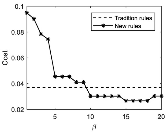 Figure 8 shows the values of cost in (29) with different β, which can also reflect the variance of uncertain granule size in Figure 7. It is seen that when β = 10 with the given coefficients, the classification rules with consideration of uncertain regions will cost less than traditional classification rules. Therefore, combining the results of Table 3 and Figure 8, we can choose Eur = 30% as the uncertain region size, then both the accuracy and cost can achieve the satisfactory requirement in the practical three-way decision-making process.