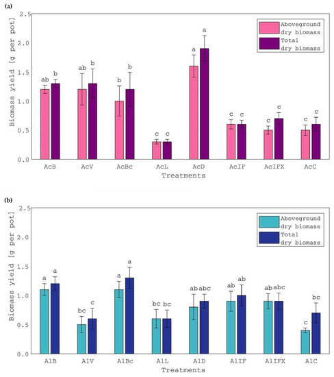 Aboveground and total dry biomass yield of white clover plants, grown in (a) acid soil treatments and (b) alkaline soil treatments. Treatment of the acid and alkaline soil, respectively, with: AcB and AlB: bentonite-treated sludge; AcV and AlV: vermiculite-treated sludge; AcBc and AlBc: biochar-treated sludge; AcL and AlL: limed sludge; AcD and AlD: air-dried sludge; AcIF and AlIF: N-P-K inorganic fertilization; AcIFX and AlIFX: P-K inorganic fertilization; AcC and AlC: control. Different letters, within each soil and property, indicate significant differences among means, using the LSD test, at p ≤ 0.05.