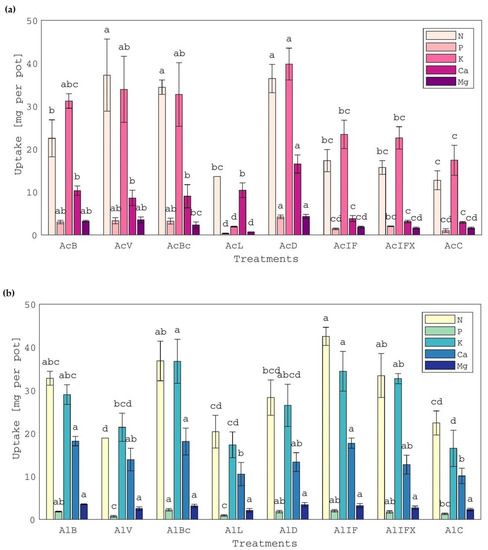 Uptake of macronutrients by white clover plants, grown in (a) acid soil treatments and (b) alkaline soil treatments. Treatment of the acid and alkaline soil, respectively, with: AcB and AlB: bentonite-treated sludge; AcV and AlV: vermiculite-treated sludge; AcBc and AlBc: biochar-treated sludge; AcL and AlL: limed sludge; AcD and AlD: air-dried sludge; AcIF and AlIF: N-P-K inorganic fertilization; AcIFX and AlIFX: P-K inorganic fertilization; AcC and AlC: control. Different letters, within each soil and property, indicate significant differences among means, using the LSD test, at p ≤ 0.05.