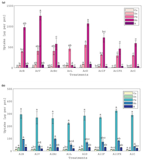 Uptake of micronutrients by white clover plants, grown in (a) acid soil treatments and (b) alkaline soil treatments. Treatment of the acid and alkaline soil, respectively, with: AcB and AlB: bentonite-treated sludge; AcV and AlV: vermiculite-treated sludge; AcBc and AlBc: biochar-treated sludge; AcL and AlL: limed sludge; AcD and AlD: air-dried sludge; AcIF and AlIF: N-P-K inorganic fertilization; AcIFX and AlIFX: P-K inorganic fertilization; AcC and AlC: control. Different letters, within each soil and property, indicate significant differences among means, using the LSD test, at p ≤ 0.05.