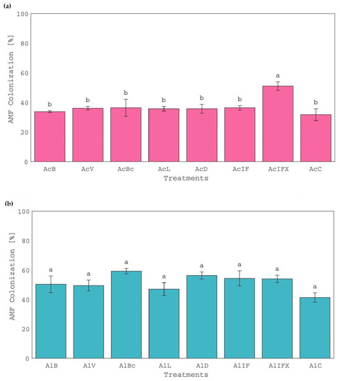 Percentages of AMF root colonization of white clover plants, grown in (a) acid soil treatments and (b) alkaline soil treatments. Treatment of the acid and alkaline soil, respectively, with: AcB and AlB: bentonite-treated sludge; AcV and AlV: vermiculite-treated sludge; AcBc and AlBc: biochar-treated sludge; AcL and AlL: limed sludge; AcD and AlD: air-dried sludge; AcIF and AlIF: N-P-K inorganic fertilization; AcIFX and AlIFX: P-K inorganic fertilization; AcC and AlC: control. Different letters, within each soil, indicate significant differences among means, using the LSD test, at p ≤ 0.05.