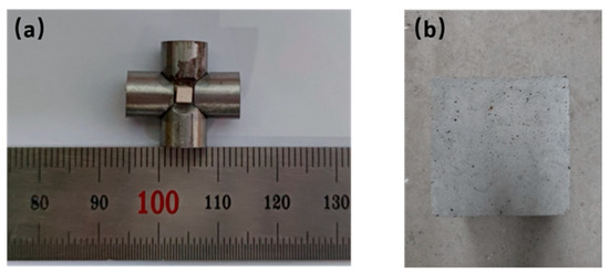 The proportions of the concrete are demonstrated in Table 1. The fresh mortar was cast into 150 mm × 150 mm × 150 mm plate molds, flattened, and compacted on a vibrating table for 10 s. Then the metamaterials absorber was put into the center of the concrete; after standing for 24 h, the molds were removed, and the samples were put into a curing room for 28 days of standard curing. Finally, the obtained concrete was cut into 125 mm × 125 mm × 125 mm to manufacture the designed EMW absorbing concrete sample, as shown in Figure 1.