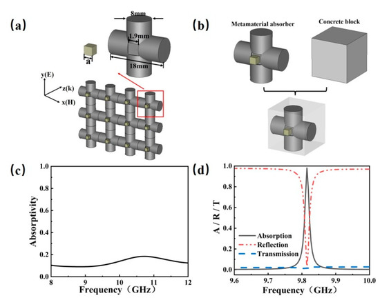 The simulated result is shown in Figure 2c,d; it can be seen from Figure 2c that the absorptivity of concrete without metamaterial absorber is about 0.1, which is low. When the metamaterial absorber is introduced into concrete as in Figure 2b, the absorptivity at 9.82 GHz reaches 98%, as shown in Figure 2d. These results indicate that the EMW absorbance is caused by metamaterial structure.