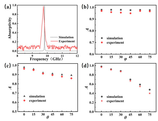 Simulation and experimental results of EMW absorption performance of the designed absorbing concrete: (a) the simulation and experimental absorption spectra; (b) absorption with different φ at 9.82 GHz; (c) absorptivity with different θ for TE mode at 9.82 GHz; and (d) absorptivity with different θ of for TM mode at 9.82 GHz.