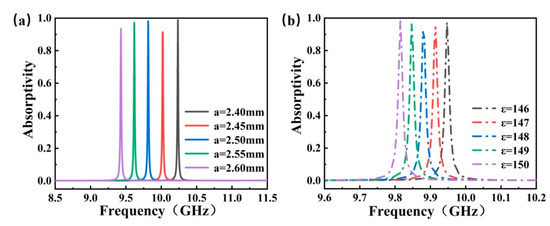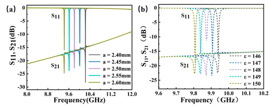 (a) simulated S11 and S21 spectra when a = 2.40–2.60 mm, ε = 150; and (b) simulated S11 and S21 spectra when a = 2.50 mm, ε = 146–150.