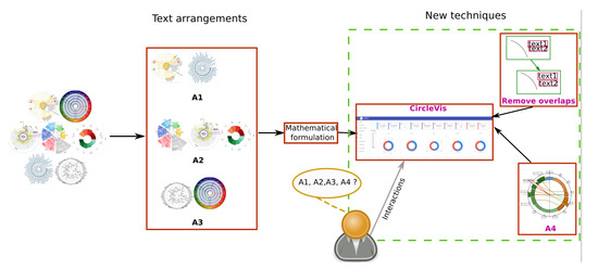 Hence, in this work we propose CircleVis, a visualization tool for encoding circles using various label arrangement techniques and label overlap removal. The following are the main contributions of this work. First, the state of the art of current labeled-circle studies on InfoVis is presented, with a focus on problem-driven approaches. Following that, a classification of the various approaches to label placement in circle layout is proposed. This study also introduces a new linear improved arrangement method for using circles with single/multiple levels while optimizing the available space. In addition, for each proposed arrangement to be implemented in the tool, a mathematical formulation is derived. A new method for detecting and removing possible label overlapping is proposed for 1D graph overlapped labels. Furthermore, CircleVis incorporates various interactions to reduce overlapping in 2D arrangement methods. Finally, a use case using COVID-19 datasets is analyzed to test, evaluate, and improve the proposed tool’s functionalities.