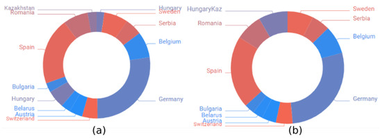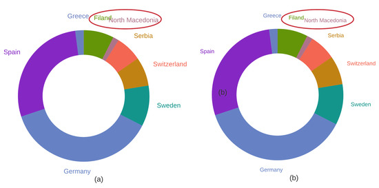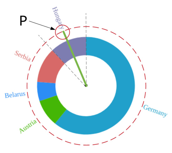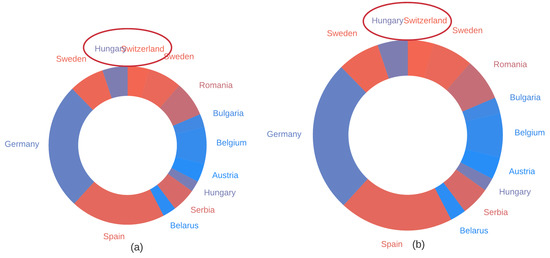 In semantic zoom, the radius of the circle becomes larger in such way that the area of each arc is expanded, allowing for extra label-drawing space. This action is useful for reducing label overlap. Figure 9 illustrates an example of this interaction. In Figure 9a, an overlap between the “Hungary” and “Switzerland” labels is observed. However, the overlap between the previous labels disappears in Figure 9b when using semantic zoom, or, specifically, by increasing the circle radius and re-drawing the circle labels.