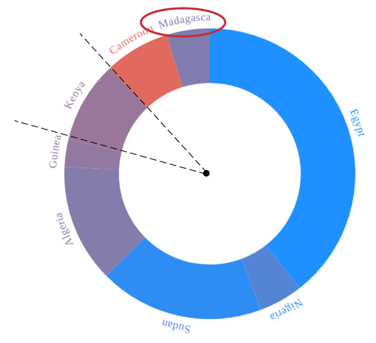 Labels in path arrangement follow the arc’s orientation. Each arc has a border length (L) that corresponds to the related arc length. However, arc lengths can be too short to draw labels with fixed sizes. Thus, users cannot see label without further interactions. In Figure 4, for example, “Madagasca” has a limited drawing space. For , is calculated using the same equation as . Labels in this case are paths that follows the arc orientation. However, they are placed in the middle of , and if is the length of associated arc, each label length must be smaller or equal to arc length . If , the label will be updated by plotting just the available length from the beginning of the label, which will be .