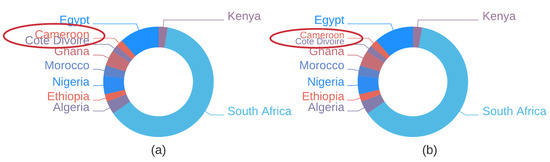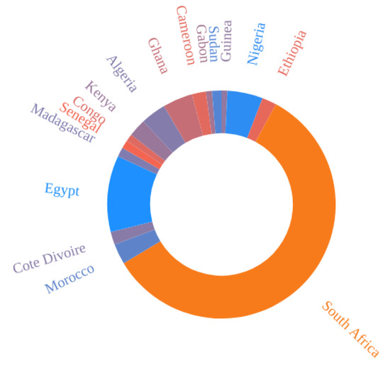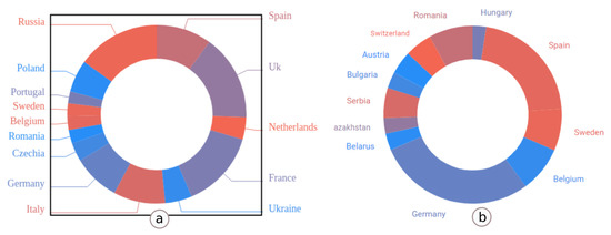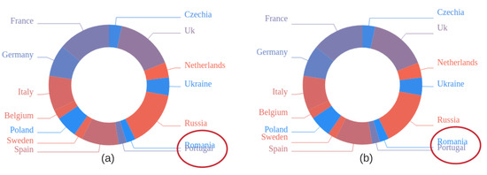 The data used for the evaluation of the proposed work were collected from WorldOmeters (https://www.worldometers.info/coronavirus/ (accessed on 1 November 2021)), and are related to the COVID-19 pandemic. This website provides real time world statistics in CSV format since the start of the pandemic. Next, the top 15 nations in COVID-19 cumulative cases until 2 September 2021 were selected to create visuals. After that, the data was categorized using the CONTINENT attribute and arranged using the ascending norm. Finally, data was shuffled to avoid the risk of overlaps at the top left of the circle because the smallest parts are consecutive and close to each other. For the proposed assessment, three datasets for the continents of Europe, Africa, and America were used. Data vary in size, with 17 countries from Europe, 16 from Africa, and 10 from America. They also have different label sizes and arc weights.