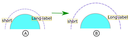 Classical linear approaches place the center of labels according to a virtual circle with fixed radius, as shown in Figure 6. As a result, all labels with varying bounding box (rectangle encompassing the label) sizes will be placed in accordance with the fixed radius. As shown in Figure 6A, the radius of the virtual circle is assigned “long labels” and “short labels” (with the point drawn). We can see that the “long label” requires more space to display the label. To deal with this, the solution is to increase the virtual circle’s radius in order to display the “long label”. However, as shown in Figure 6B, a label with a small size can deviate from the real circle.