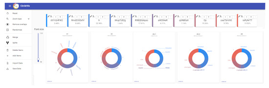 The tool bar can be found on the left side of CircleVis in Figure 13. It contains several interactions to help users extract knowledge from the dataset. As discussed before, the interactions include zooming in or out, adding or removing objects, and changing the font size, labels, percentages, and colors. Additionally, the possibility of using an overlap-removal algorithm is offered. Users can also export or save their data in a structured JSON format or save individual circles as SVG files.