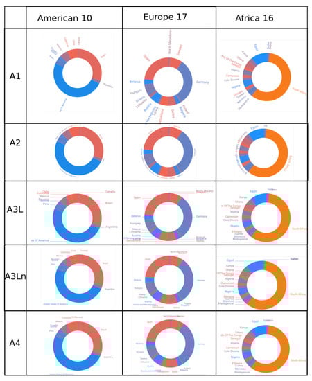 User evaluations for the label arrangement methods are illustrated in Table 2. The majority of users chose the arrangement for each data source because of the small arc weight and extended label length. Furthermore, Figure 15 indicates different dataset visualizations using the proposed arrangements. The obtained results show that labels in do not overlap in short arcs. Unlike the arrangement, labels are not completely written because they are long and related to small arcs (arrangement fails). The structure was preferred, particularly with the Europe and America datasets. This was due to label length having no bearing on the structure. Moreover, the Europe dataset’s arcs are a bit wide despite its 17 elements, and the America dataset contains only 10 elements and three minor arcs that cause a small overlap. For the Europe and Africa datasets, most users accepted the and arrangements because they do not produce label overlaps in all test dataset. This was commonly accepted despite having two or three overlaps, in contrast to America (which has the fewest elements (10)), which has six or seven overlaps that are unacceptable or incomprehensible.