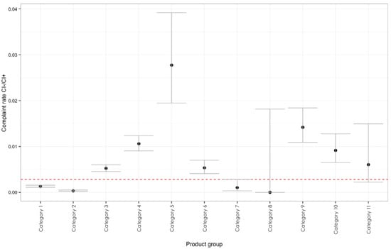 Product complaint rates for each category (presented as dots) together with 95% confidence intervals and the overall return rate (presented as dashed line).