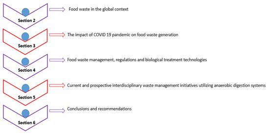 The remaining part of the paper (as shown in Figure 1) is organized as follows: Section 2 reviews the literature that deals with food waste in the global context: - this section provides an overview of the impact of food waste on the environment, economy, and natural resources on a global scale. Section 3 then discusses the impact of the COVID-19 pandemic on food waste generation: this section briefly highlights the impact of COVID-19 on global economic losses, waste management, and circular economy. Section 4 reports on food waste management, regulations, and biological treatment technologies: - this section briefly discusses waste management and policy challenges, consumer awareness as a technique for reducing food waste, and anaerobic digestion as a viable alternative to food waste management, energy generation, and nutrient generation. Section 5 provides a comprehensive overview of the current and future interdisciplinary waste management initiatives utilizing anaerobic digestion systems: - this section discusses potential and emerging collaborations from multiple disciplines (such as bioengineering, artificial intelligence, omics, and nanotechnology) to address the various waste management crises. Section 6 then details the review’s conclusions and recommendations.