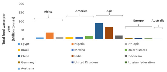 Food waste is described by the United Nations Food and Agriculture Organization (FAO) as food wastage that happens at the end of the food chain, attributable to the actions of both consumers and retailers [53]. The Sustainable Development Target 12.3 intends to significantly reduce the quantity of food waste by 2030. Indeed, there is an urgent need to meet this goal since food waste currently overburdens waste management systems, exacerbates the food insecurity crisis, and places a burden on the environment and economy. The 2021 Food Waste Index of the United Nations Environment Programme indicates that 931 million tonnes of food is wasted annually by households, stores, and the food service industry [1]. To put this into perspective, roughly 570 million tonnes of this worldwide wastage comes from households. In comparison, the food service industry contributes 244 million tonnes, and the retail sector contributes 118 million tonnes, respectively. The total household food waste produced in selected countries is presented in Figure 2. Here, China (91 million tonnes/annum), India (68 million tonnes/annum), Nigeria (37 million tonnes/annum), Indonesia (20 million tonnes/annum), United States (19 million tonnes/annum) were the most significant contributors to food waste. In comparison, Australia (0.25 million tonnes/annum) generates remarkably low amounts.