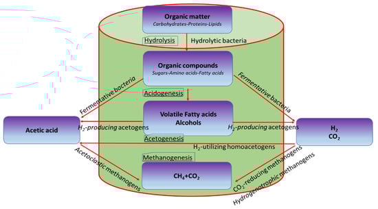 Additionally, lipolytic bacteria secrete lipases, which break down lipids (fats and oils) into valuable products like long-chain fatty acids and glycerol [110]. In the acidogenesis phase of anaerobic digestion, hydrogen, alcohol, carbon dioxide, and acids, including isobutyric, propionic, and lactic acid, are produced by oxidizing carbohydrates and organic molecules produced during hydrolysis [111]. On the other hand, acetogenesis is the process by which acetogenic bacteria and obligatory hydrogen-producing bacteria convert acidogenesis products into acetate and hydrogen gas [110,112,113]. Thereafter, acetogenic bacteria convert volatile fatty acids and alcohol into hydrogen, carbon dioxide, and acetate, while homoacetogenic bacteria convert carbon dioxide and hydrogen into acetate [114]. Moreover, propionate decomposers, butyrate decomposers, and acid formers also play a significant role in anaerobic digestion processes [110]. Methanogenesis is the final step in the anaerobic digestion process. This stage occurs when acetic acid is converted to methane gas [115]. Methanogenesis can take place via two primary pathways: the hydrogenotrophic pathway, in which hydrogen and carbon dioxide gasses are converted into methane; and the acetotrophic pathway, in which acetate is eventually converted to biogas (methane) [116,117,118]. The methane generated by either method can be used in combined heat and power generators [119].