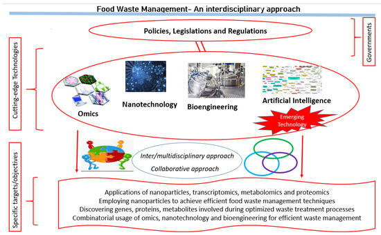 According to our analyses, the most efficient waste management systems should provide nutritional and economical solutions that are both sustainable and equitable. Of note, the hierarchical structure of the present perspective encourages expertise from various disciplines to collaborate to address issues relating to waste management throughout the food supply chain. A multi-technological strategy that includes government initiatives and advances in bioengineering/bioprocess engineering, omics, artificial intelligence, and nanotechnology is crucial for waste management, and vital for maximizing its efficiency. The most successful waste management solution on a global scale remains the incorporating of current and emerging cutting-edge technology while promoting government accountability (legislation, regulations, etc.). Figure 4 depicts the recommended multidisciplinary approach system that is thoroughly discussed in the subsequent sections.