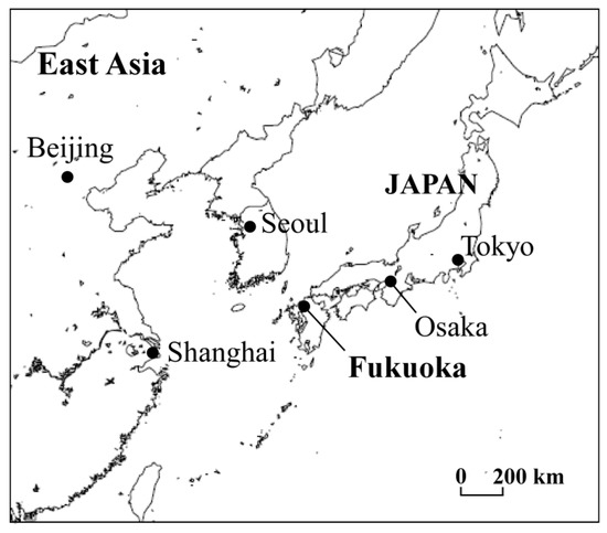 The location of Fukuoka is shown in Figure 1. Fukuoka is a large city with a population of 1.5 million. It is located in the west of Japan and is subject to transboundary air pollution during the winter and spring seasons [5,6,7,8,9,15].